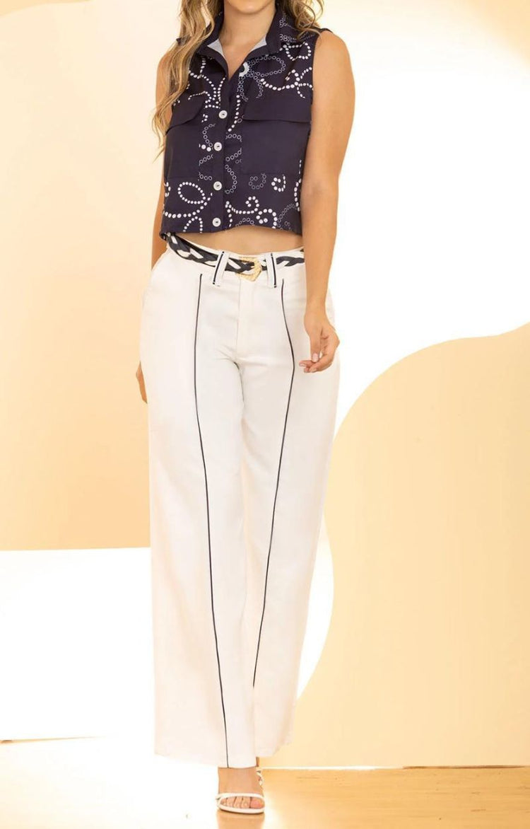 Conjunto presenta un equilibrio perfecto entre elegancia casual y sofisticación moderna. La blusa sin mangas en color azul oscuro, decorada con un patrón de inspiración náutica, se complementa con un pantalón palazzo en blanco puro. El pantalón, de talle alto y pierna ancha, acentúa la figura con sus líneas contrastantes a lo largo de las costuras, mientras que la blusa incluye detalles de ojales que añaden un toque único y contemporáneo. Ideal para eventos casuales o semiformales donde se busca destacar con un estilo refinado y a la moda.
