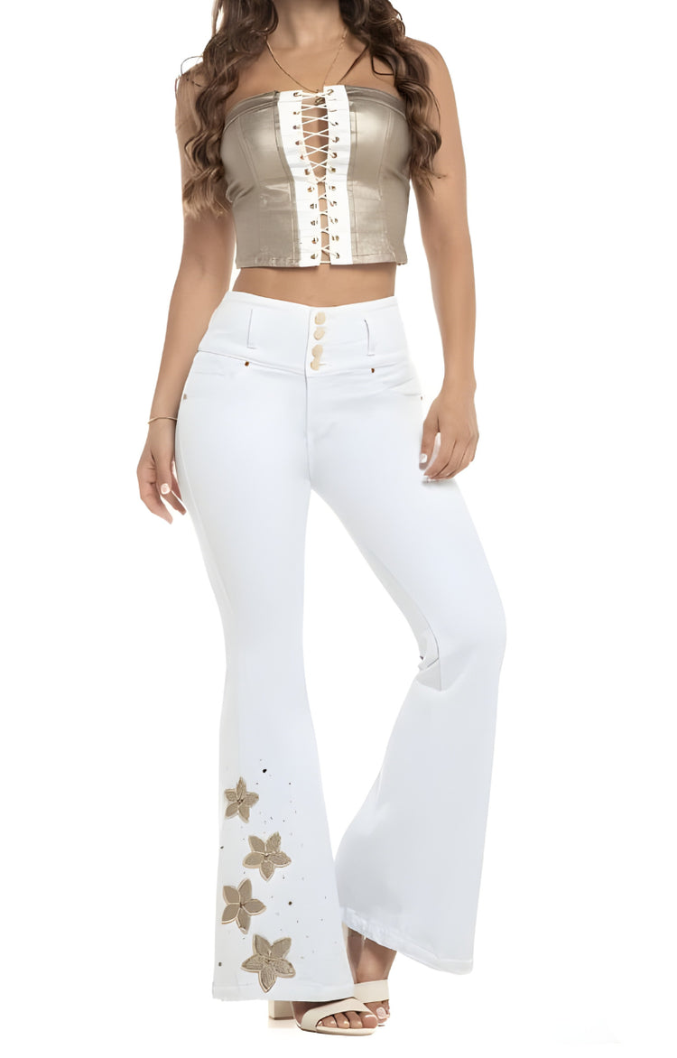 Set denim Blusa Top y Jeans Levantacola 100% colombiano, tiro alto, Silueta ajustada con efecto push up. bolsillos traseros. Bota skinny