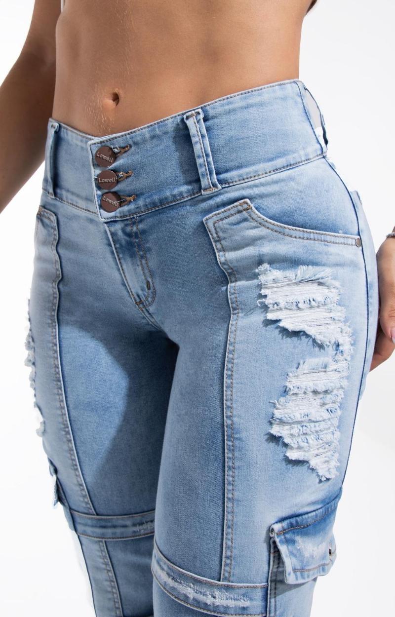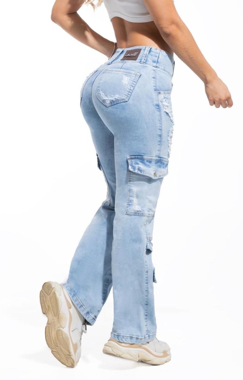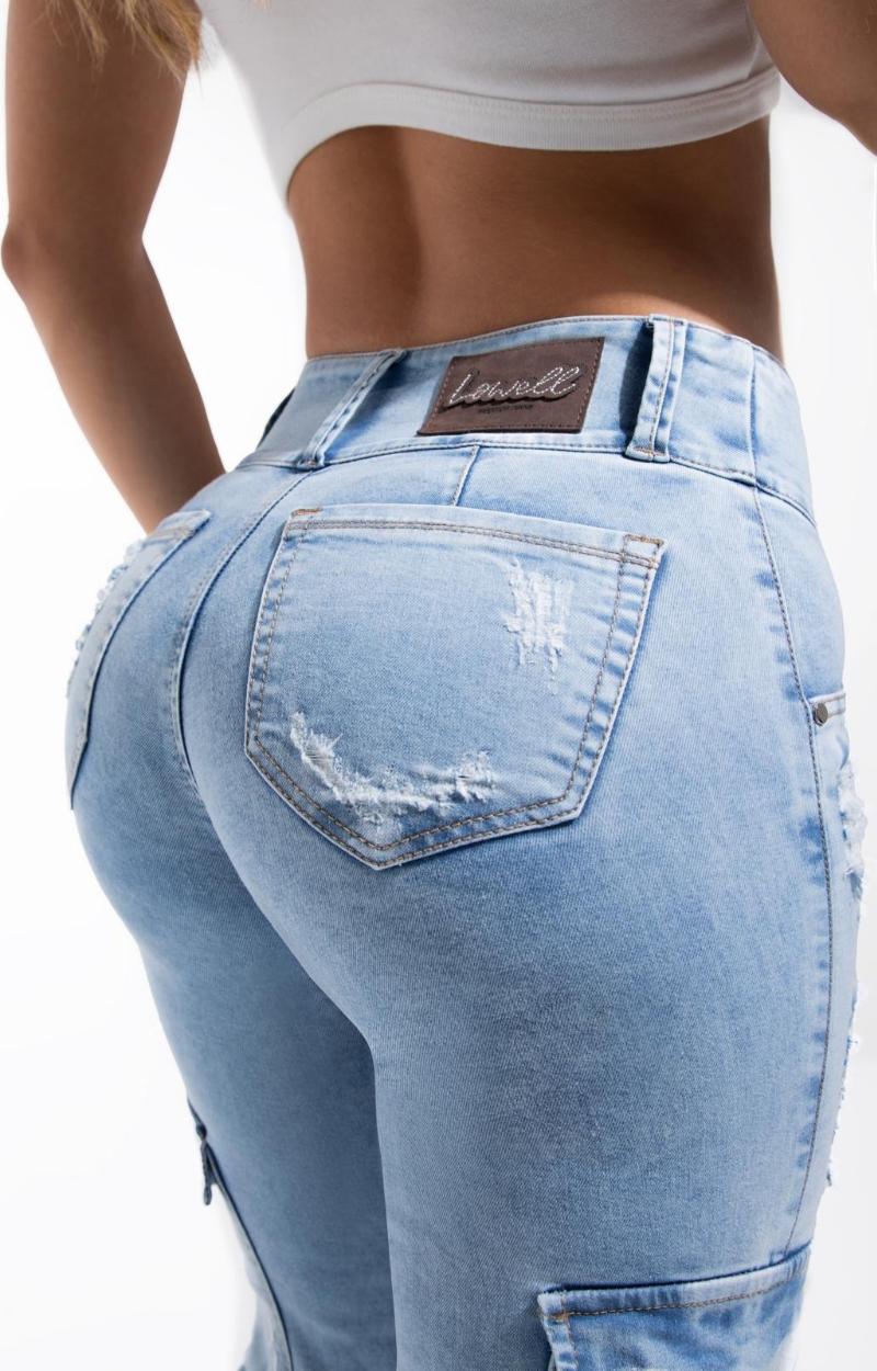 Jeans Levantacola 100% colombiano. Silueta con efecto push up. Con Bolsillos posteriores. Estilo tipo cargo