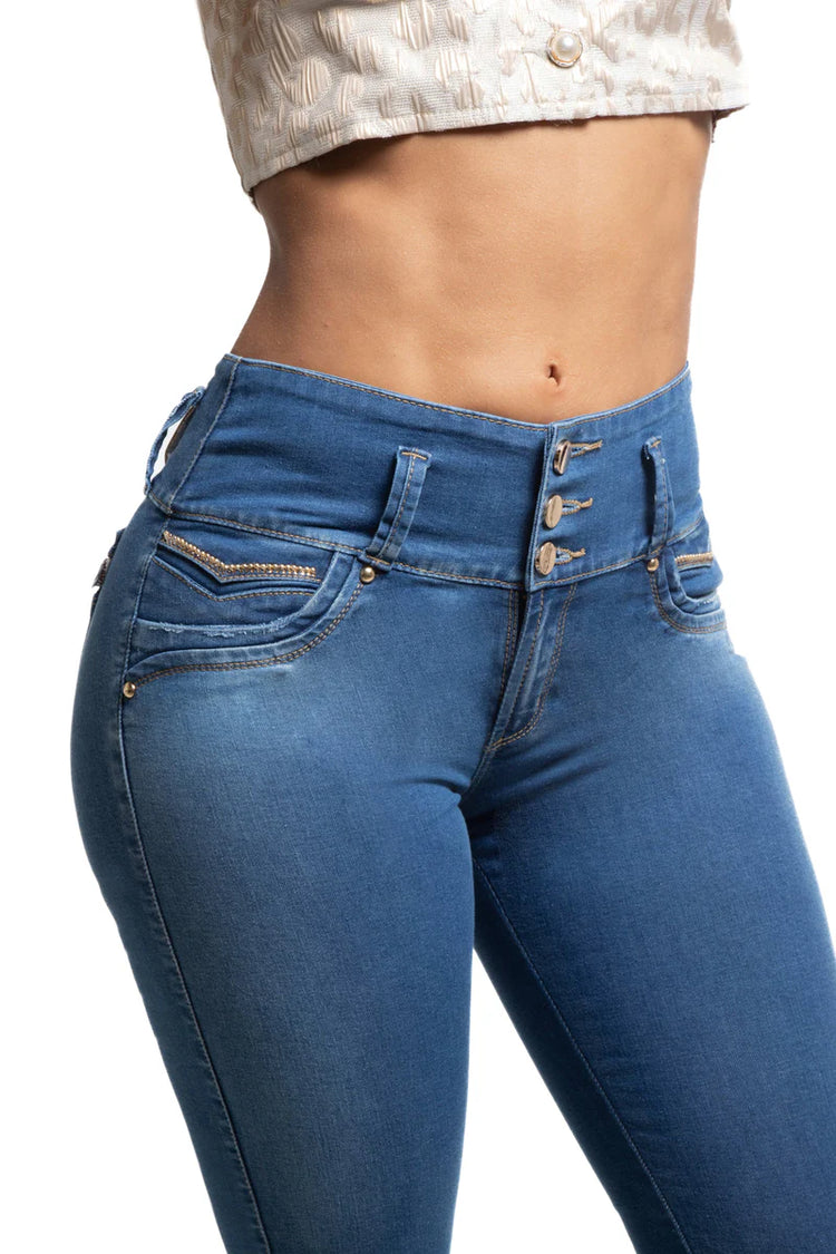 Jeans Levantacola 100% colombiano, tiro alto, Silueta ajustada con efecto push up. bolsillos traseros. Bota skinny